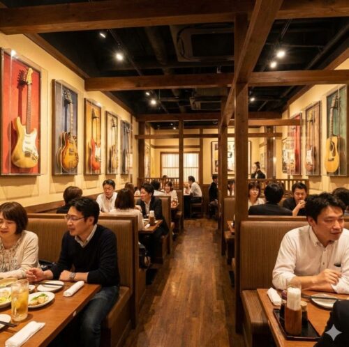 新店舗のインテリアは「花街文化とロックの融合」がテーマ。店内に入ると、ハードロックカフェらしいギターや衣装の展示(メモラビリア)がありつつも、舞妓さんや和の要素を取り入れたスタイリッシュな空間が広がっています。