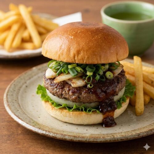 ジューシーなパティに、京都名物の「千枚漬け」、アボカド、トマトをトッピングし、味噌ベースのわさびソースで仕上げた一品。