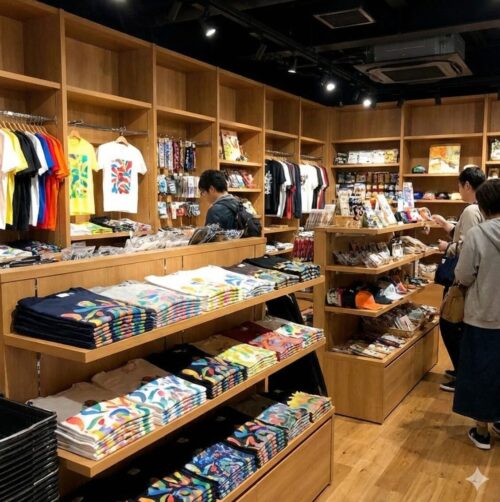 Tシャツやピンバッジ以外にも、京都店ならではのユニークなコラボグッズが充実しています。