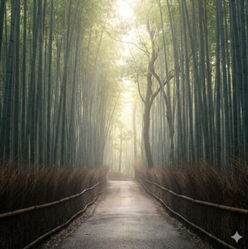 誰もいないまっすぐな竹林の道で深呼吸をすると、体の内側から浄化されるようで、本当に気持ちが良いものです。