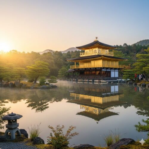 • 09:00 金閣寺到着:開門と同時に入場します。朝の光に照らされた金閣は神々しく、水面への映り込み(逆さ金閣)もきれいに撮影できます。
